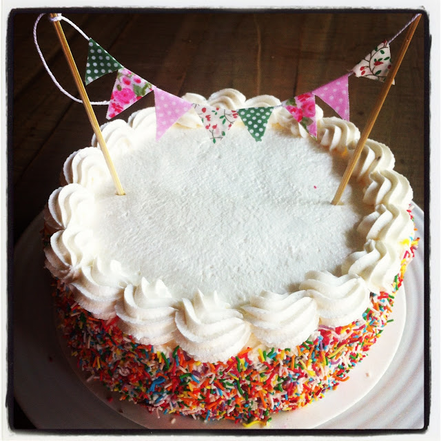 This weekend was huge. It was Naomi's birthday on friday and a few little friends popped over for afternoon tea. Of course there was cake, but this year was the first year that I did not bake. Nope. I BOUGHT that cake and I made a little bunting to pop on top. I thought it was quite chic and cute and she loved it.